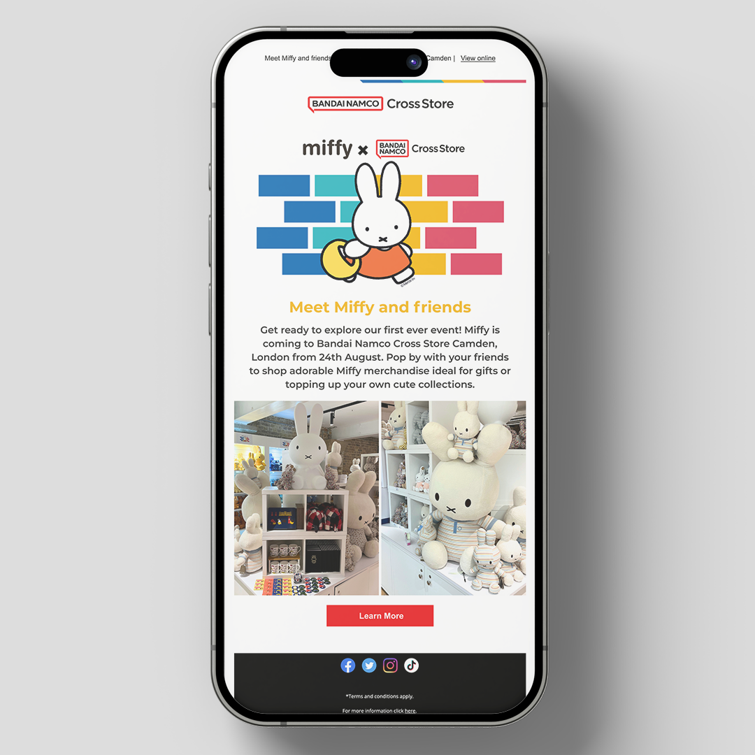 From anime icons to Miffy herself, every asset needed to be on-brand, approved, and handled with care, while still feeling playful, shareable and distinctly Bandai Namco Cross Store.